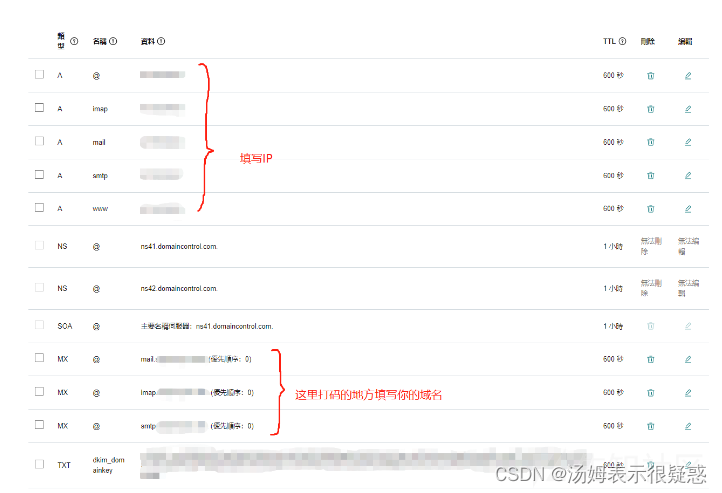 其中 TXT 记录里的 dkim_domainkey 用于提高邮件可信度。这里不进行赘述。
