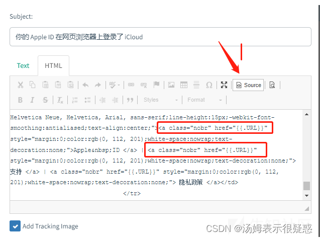 导入后点击 Source 就可以看到邮件内的所有链接替换成了 {{.URL}}。