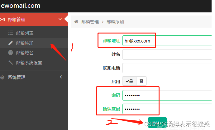 在后台的左侧栏找到邮箱添加,这里使用 hr@xxx.com/12345678 作为账号的用户名和密码。