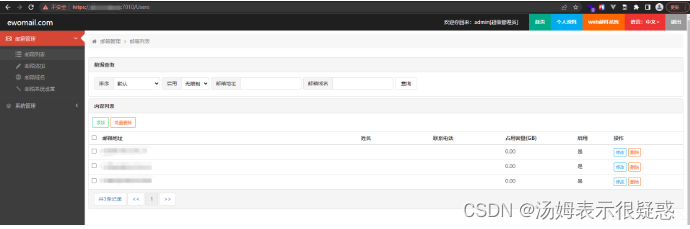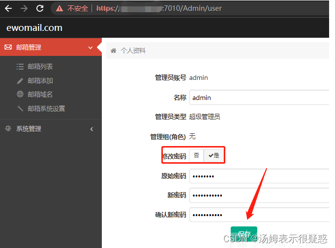 我们先通过账号admin/ewomail123 进入到邮箱管理后台,再进到个人资料处进行密码更改。