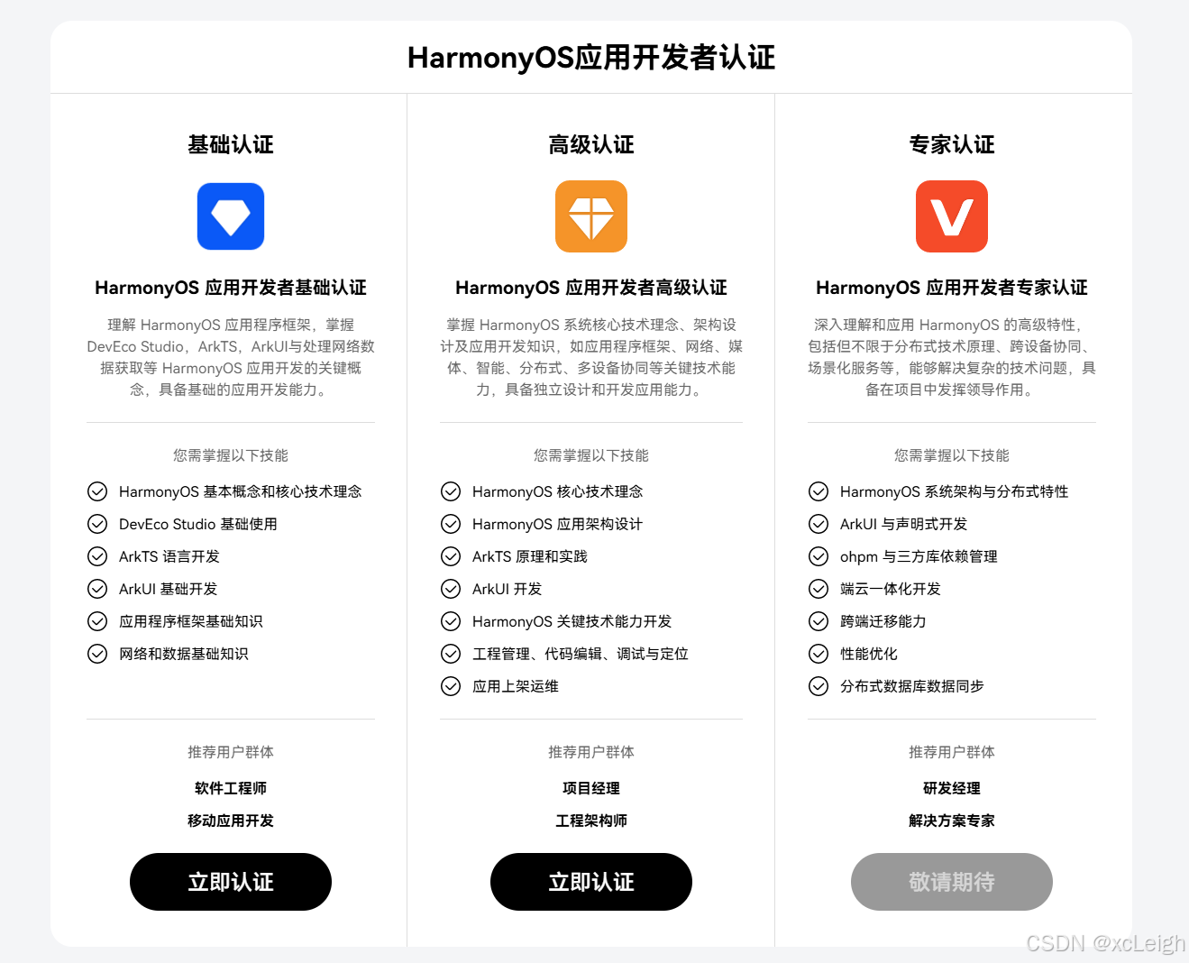 🔆 官方打造了针对不同角色、技术领域和业务场景的认证,让开发者能证明自己的专业水平和能力。其中,和 HarmonyOS 应用开发相关的认证有基础认证和高级认证,还有一些认证处于 “敬请期待” 的状态,比如应用市场增长优化师中级认证、鲸鸿动能广告初级优化师认证等。
