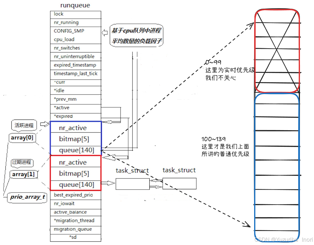queue一共有140个元素,一个元素就是一个进程队列,其下标映射了优先级。前100个元素代表实时优先级(我们不关心)后40个代表我们上面所讲的普通优先级