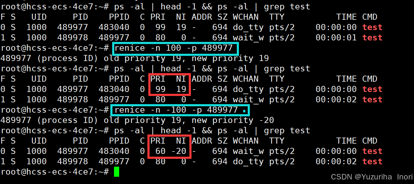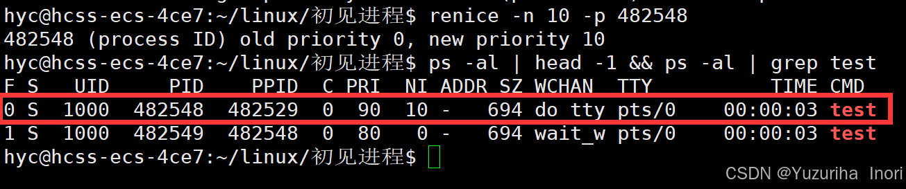 如图,通过renice指令来修改进程的优先级后,我们再次查看进程信息可以发现第一个被修改的进程NI变成了10最终的优先级变成了90。 说明默认值是不改变的,优先级修改是通过nice值的修改而实现的