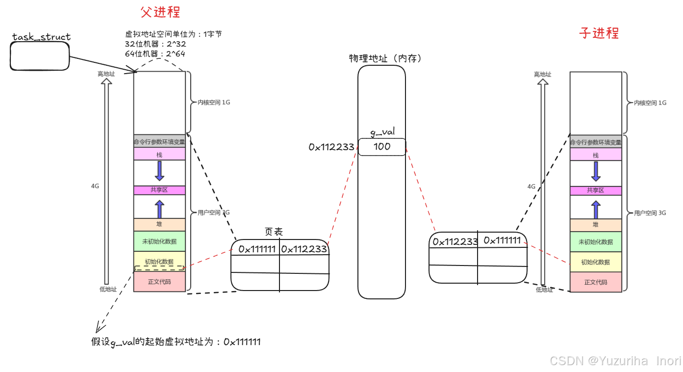 如果我们创建一个子进程,我们知道子进程的task_struct是拷贝父进程的,而子进程与父进程共享代码与数据(没有新继承加载进来的情况下)这也就意味了子进程的页表映射关系与父进程一模一样。