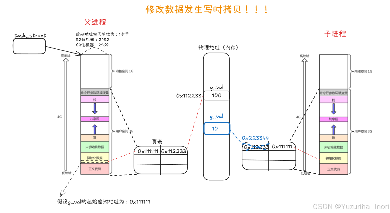 子进程修改数据会发生写时拷贝:在物理空间上重新开辟,并在页表中重新建立映射关系。注意:虚拟地址并没有改变,仅仅改变了物理地址!!!
