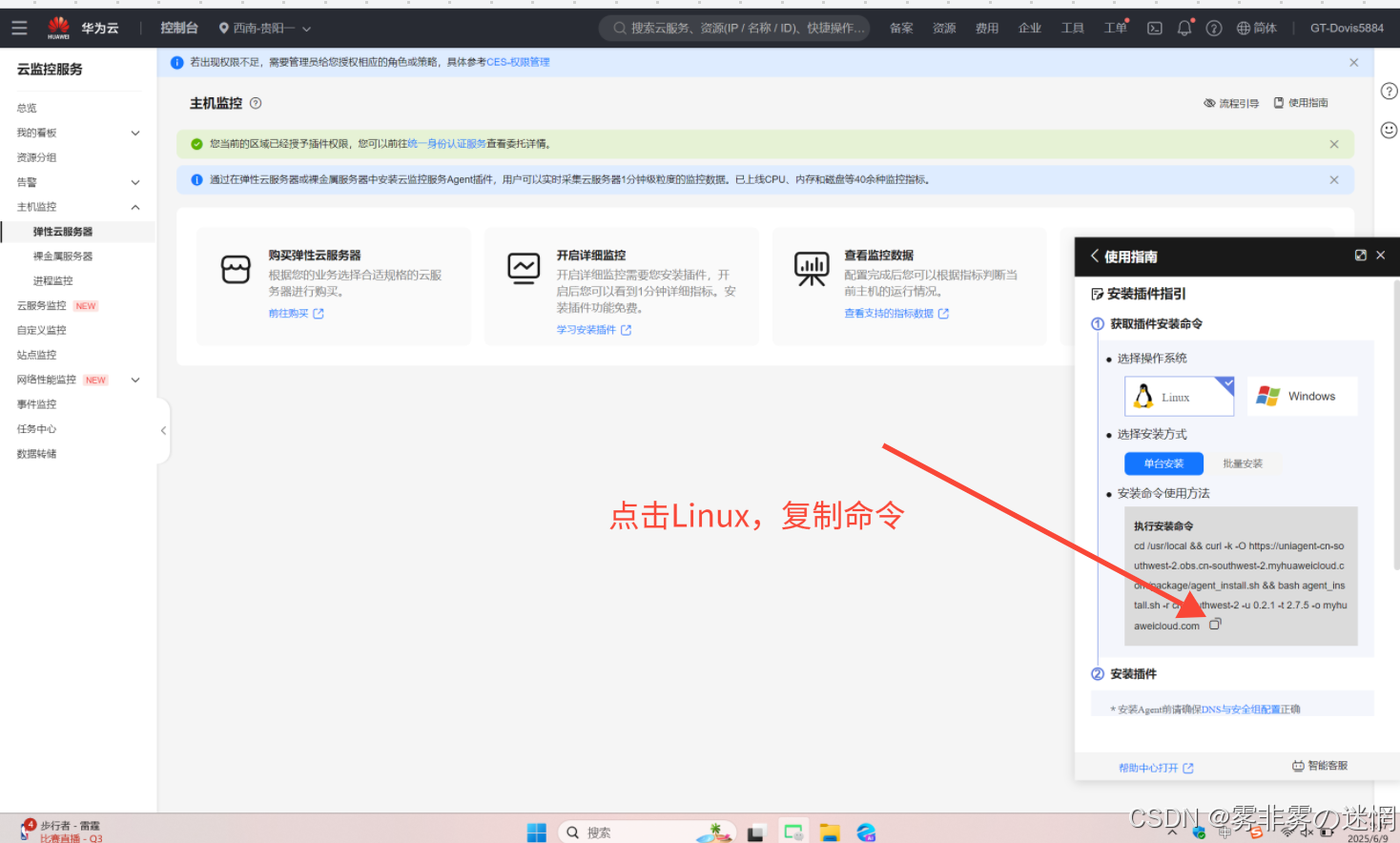 (5)点击弹性云云服务器,点击“开始详细监控”,点击 Linux,复制下面的执行命名