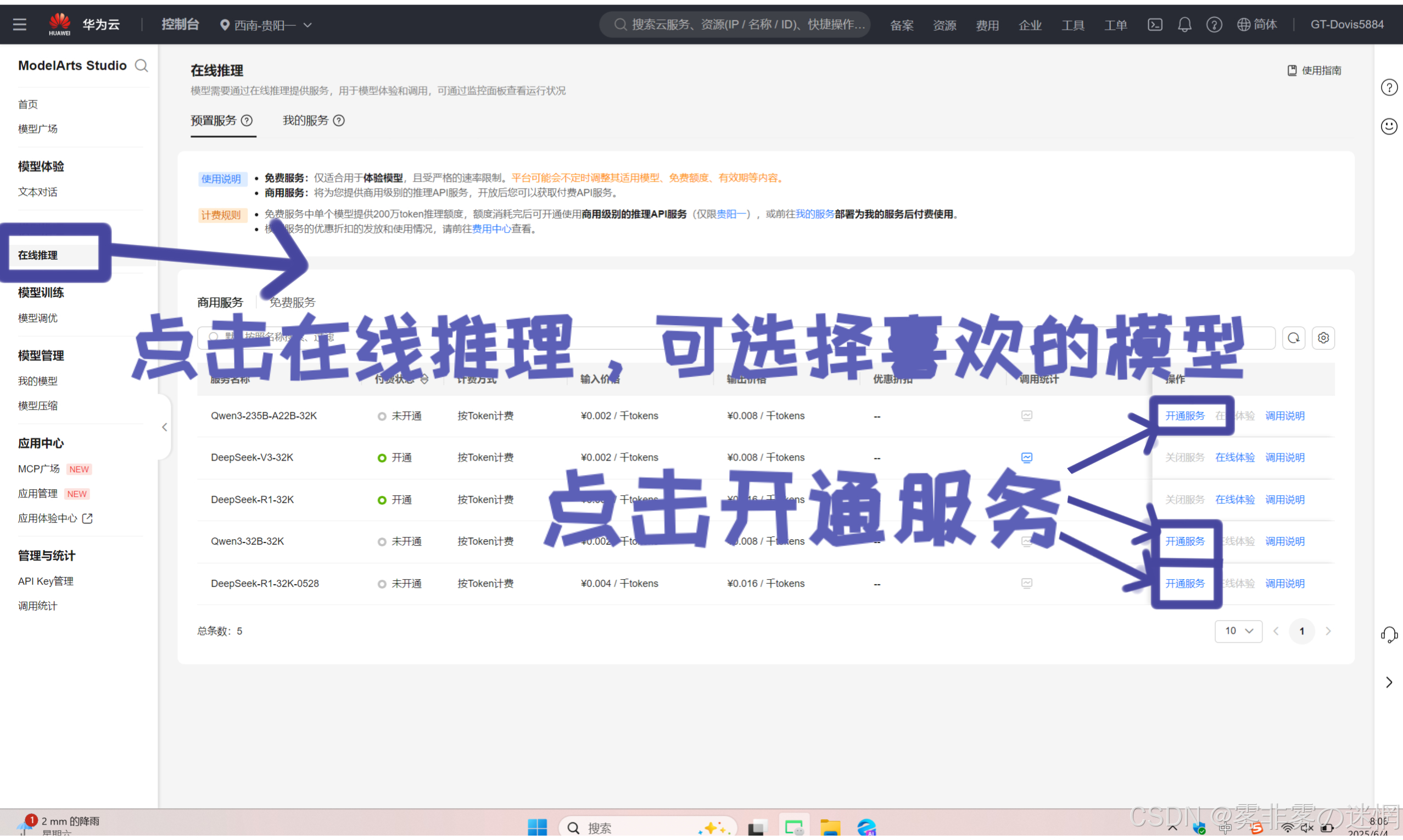 (3)点击左边功能栏的:在线推理,开通喜欢的模型