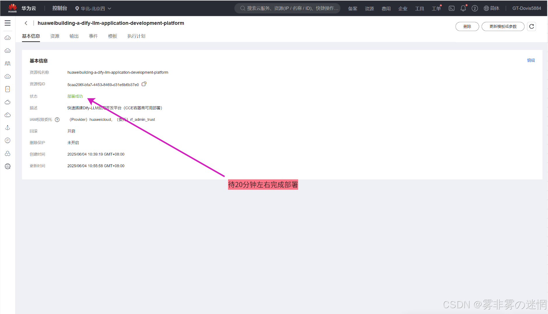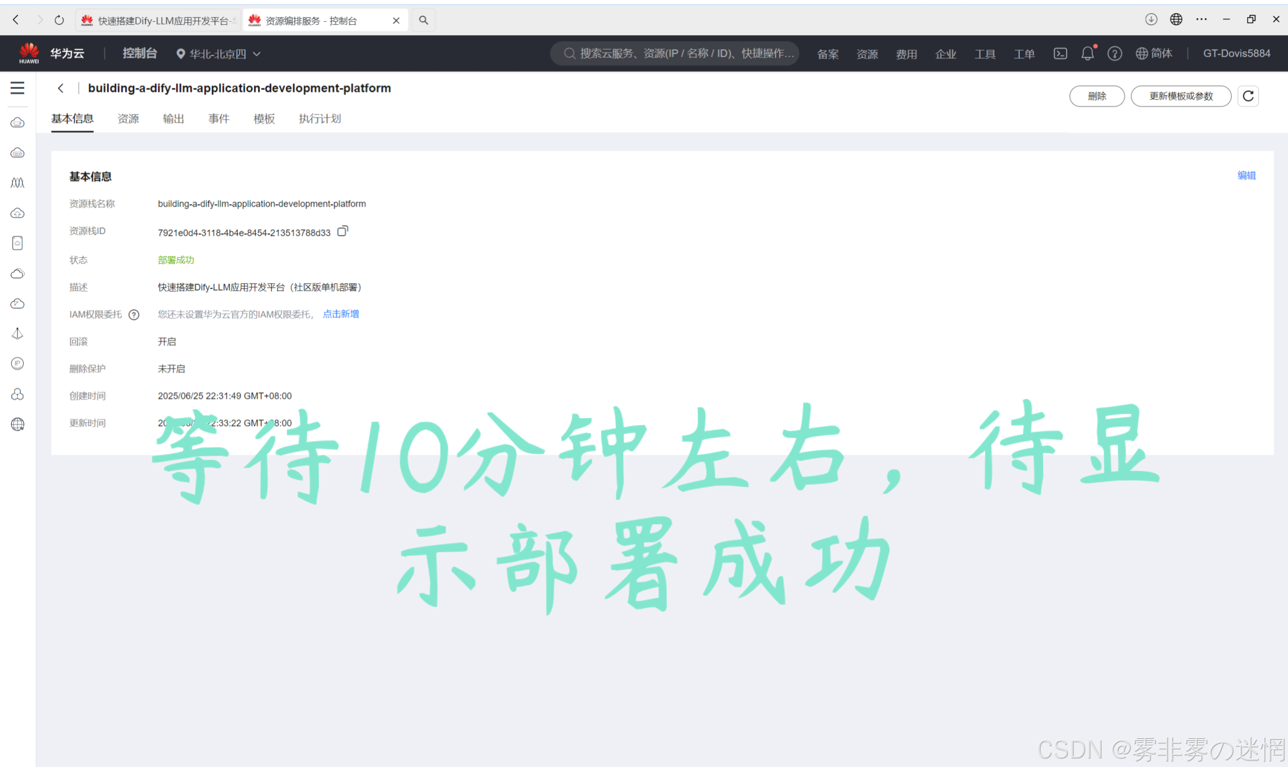 (7)预计10分钟会显示部署成功,打开“输出”,这里的IP就是后面登录Dify的公网IP