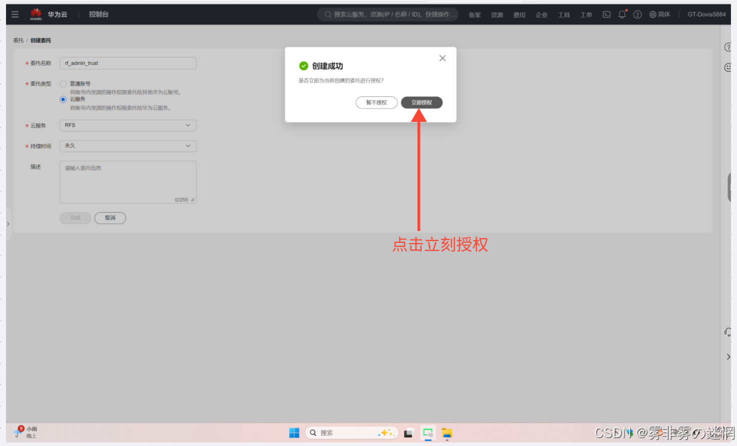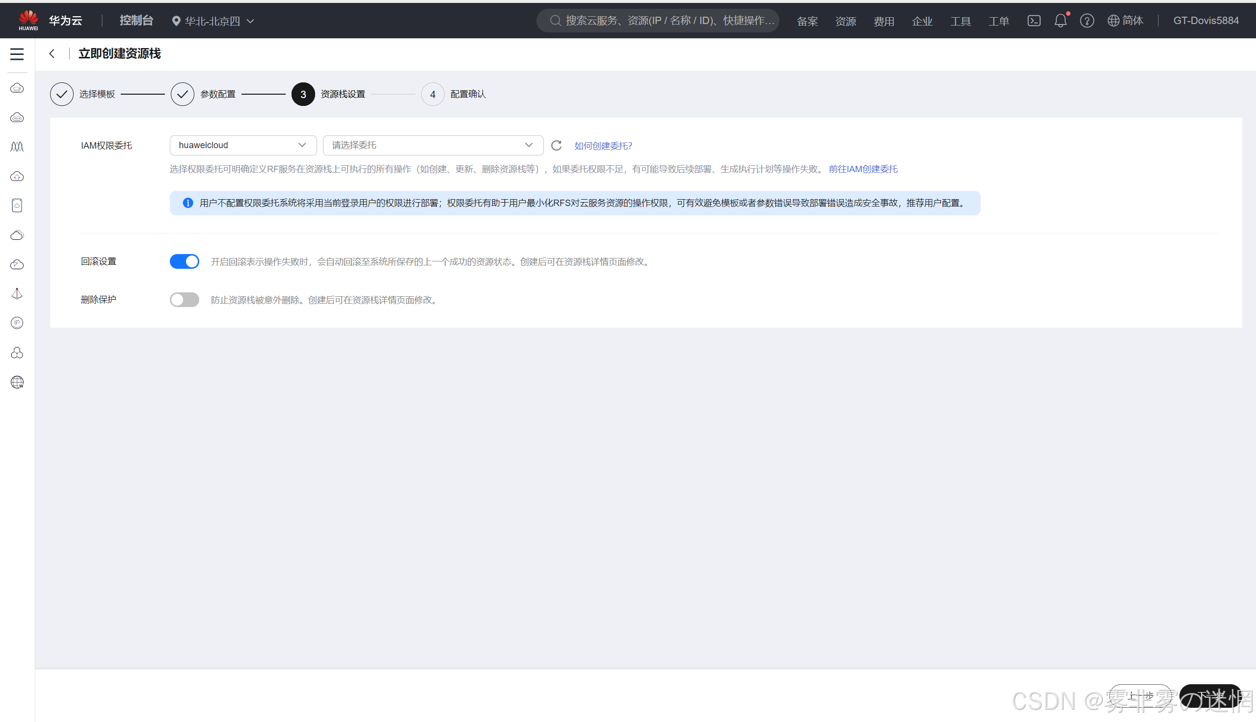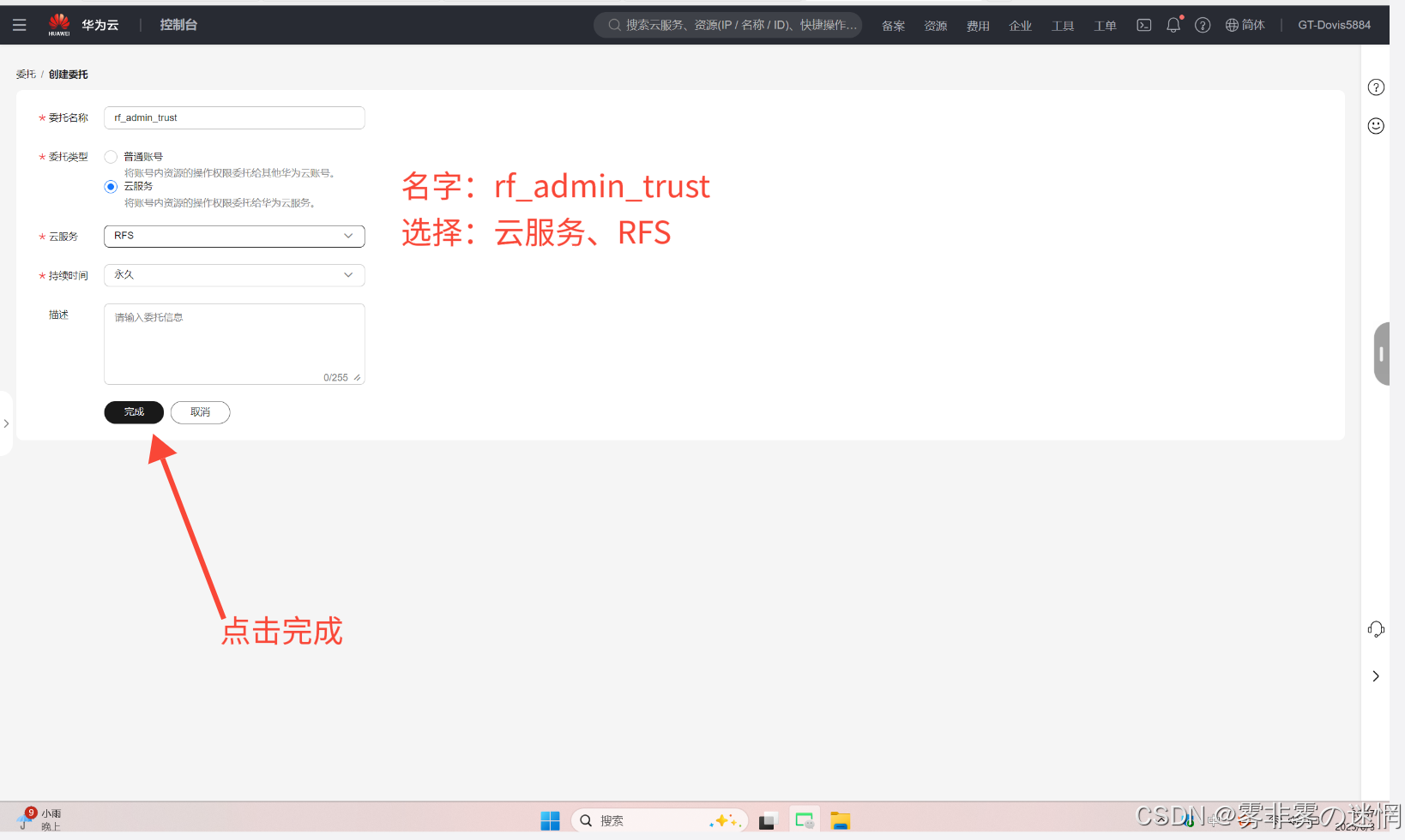 (2)名字设置为:rf_admin_trust,选择云服务,RFS编排,完成委托的配置