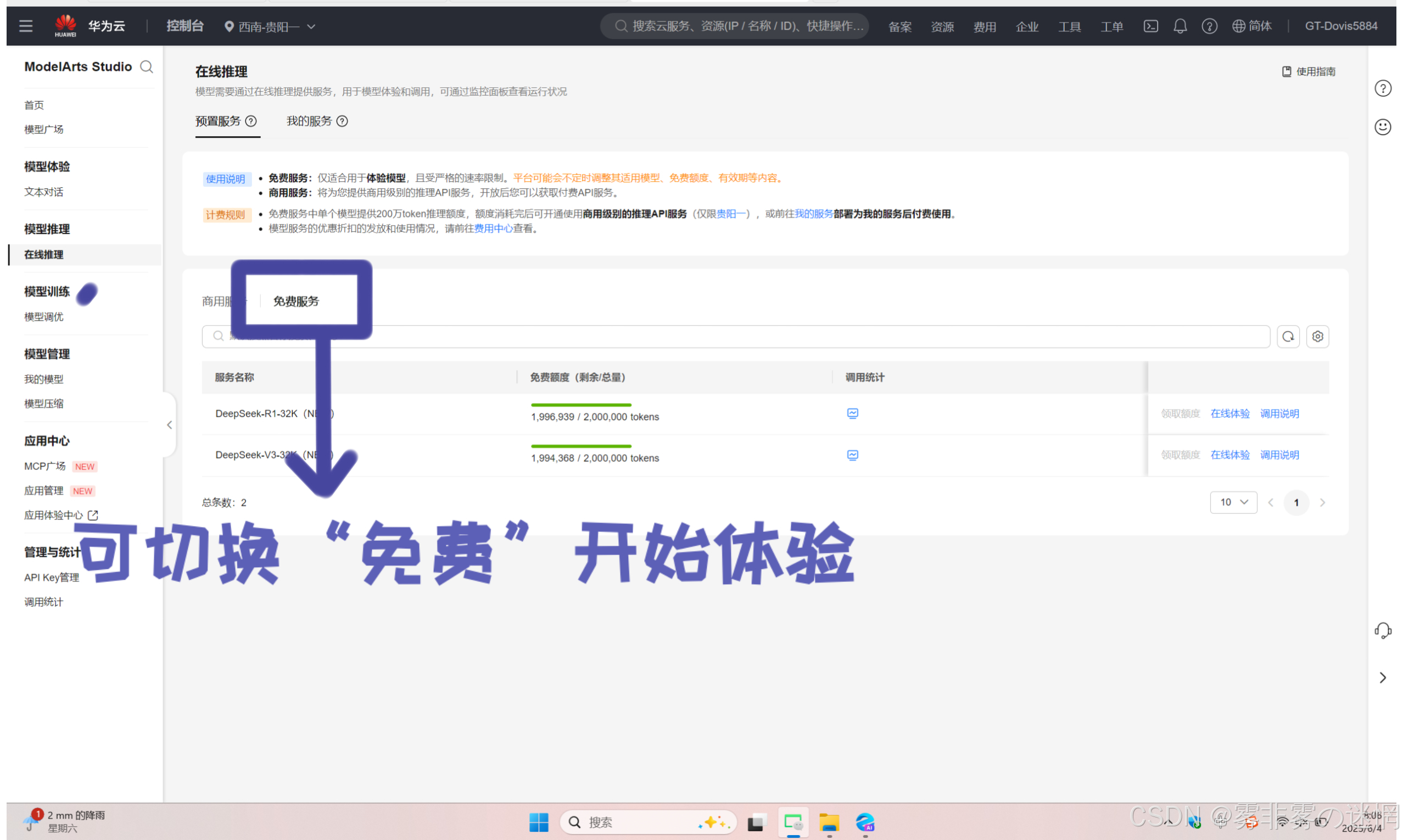 我最近体验了开通华为云 ModelArts Studio 平台上的 DeepSeek R1/V3商用服务。这次体验让我深刻感受到华为云在人工智能服务领域的便捷性和高效性,以下是我的心得体会: