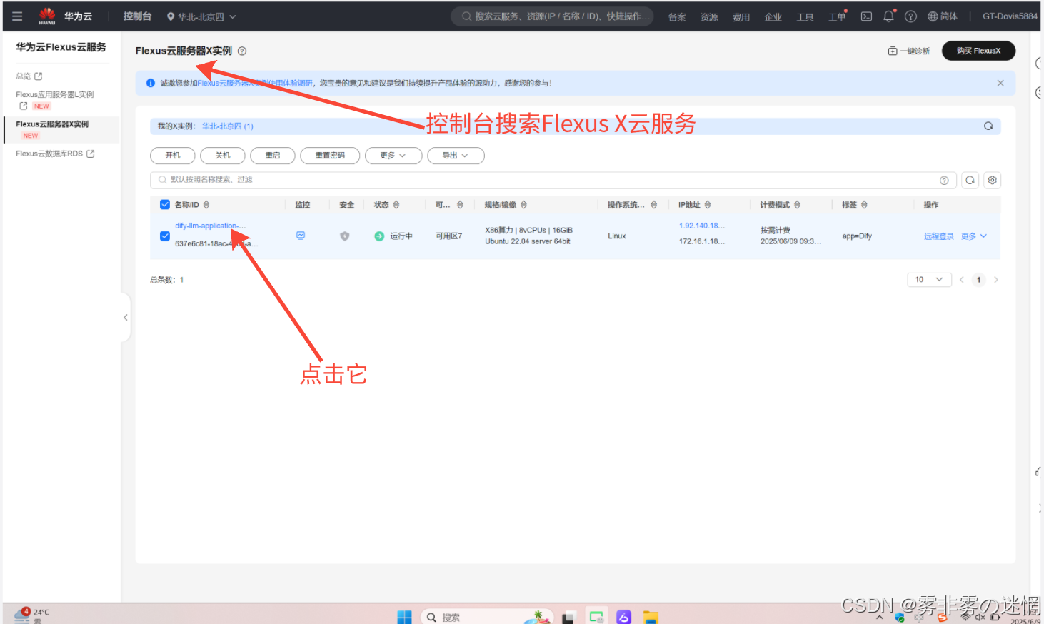 (1)搜索“Flexus云服务”,点击Flexus X实例,点击这个已经部署的实例