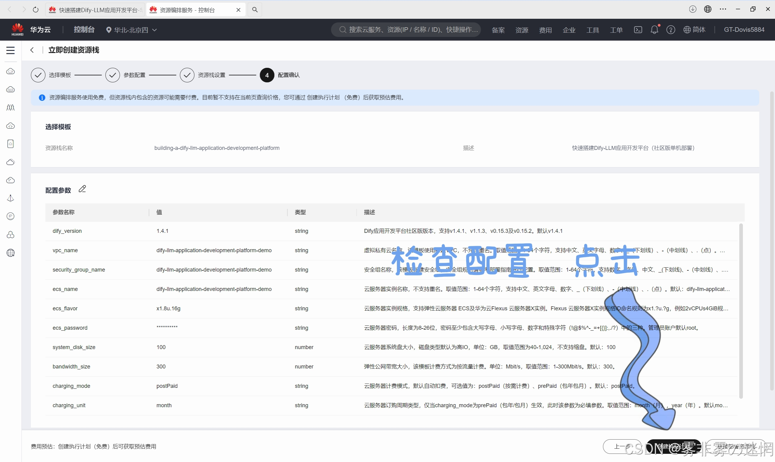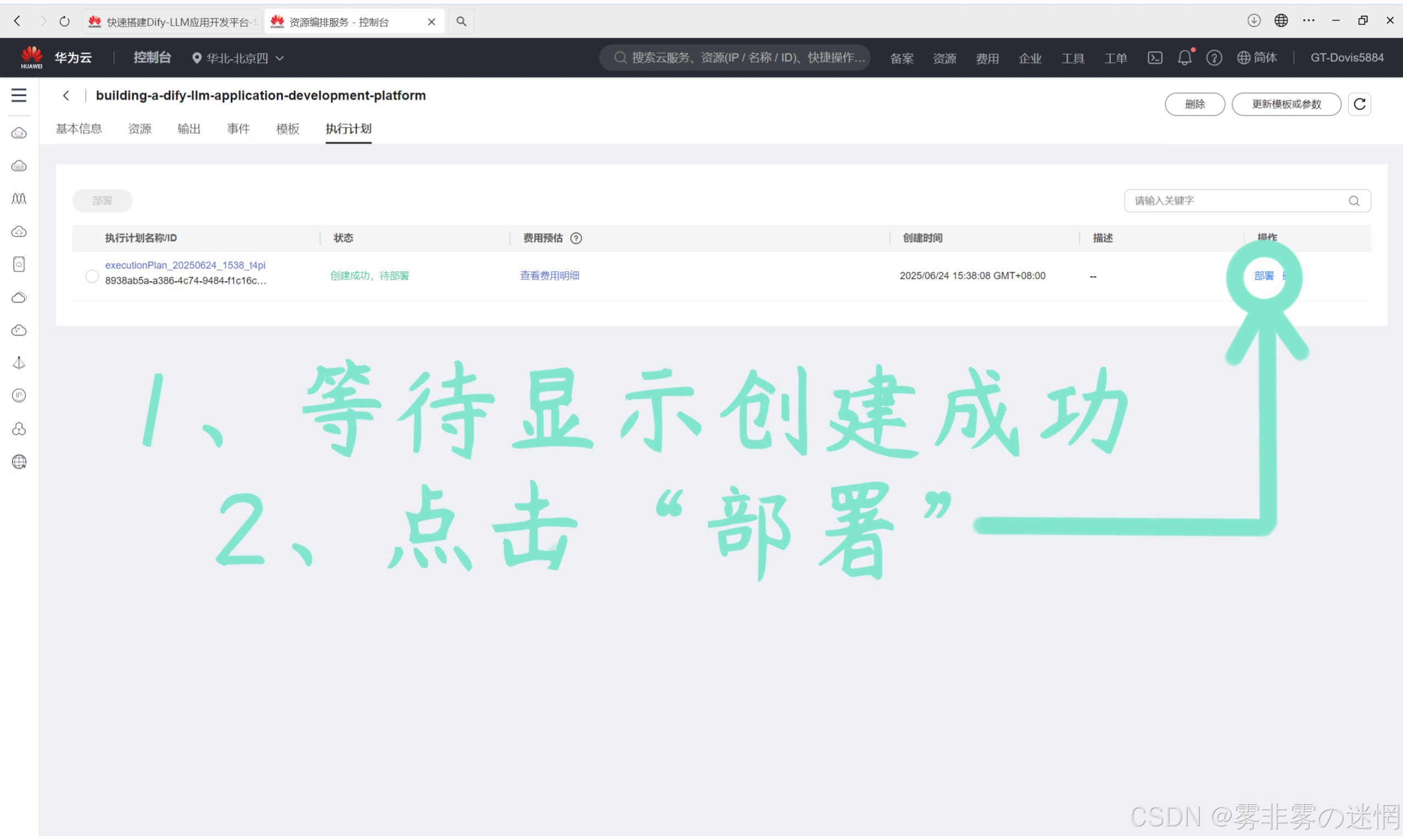 (6)待显示创建成功,点击开始部署,执行,大约20分钟可以获得DIfy的公网IP