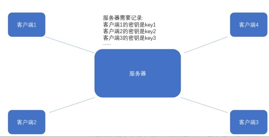 但事情没这么简单. 服务器同一时刻其实是给很多客户端提供服务的. 这么多客户端, 每 个人用的秘钥都必须是不同的(如果是相同那密钥就太容易扩散了,黑客就也能拿到了)。因此服务器就需要维护每个客户端和每个密钥之间的关联关系,这也是个很麻烦的事情~