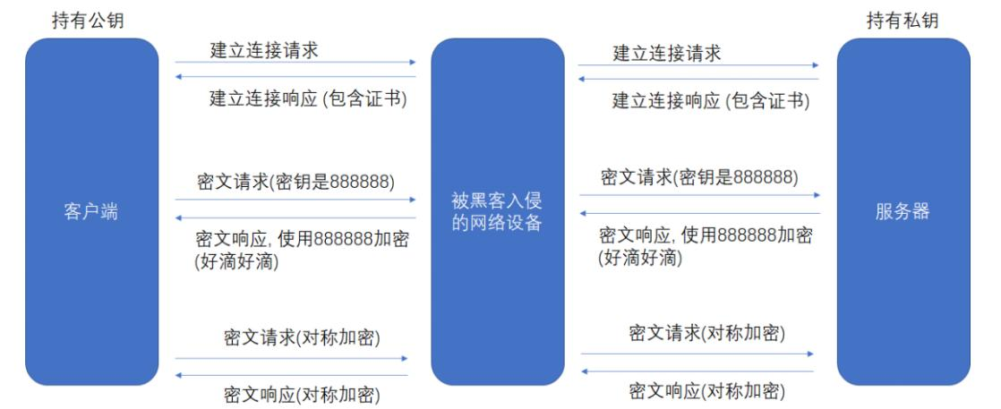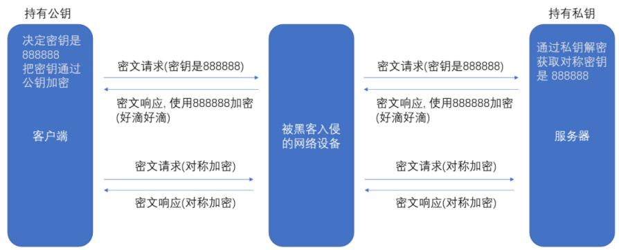 但是如果直接把密钥明文传输, 那么黑客也就能获得密钥了~~ 此时后续的加密操作就形同虚设了。
