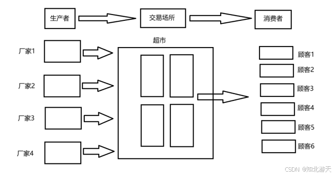 为什么有了超市,效率就高?假设没有超市,消费者就要找生产者拿所需的资源,而这也需要耗时,生产者生产也需要资源,导致消费者直接找生产者拿资源会很麻烦,但是如果生产者和消费者之间加了一个超市,就高效了呢?这是因为,生产者生产完资源后可以在超市中进行存储,消费者要资源的时候,就可以直接提供,不需要等了,这也符合为什么输入设备和输出设备之间为什么需要一个内存,一个道理。(超市—>大号的缓存)
