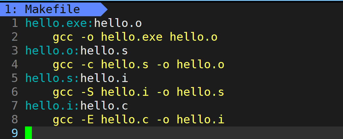 我们可以把关系搞复杂一定,我们进行预处理,编译,汇编,链接这几个过程,这个时候makefile文件就成了: