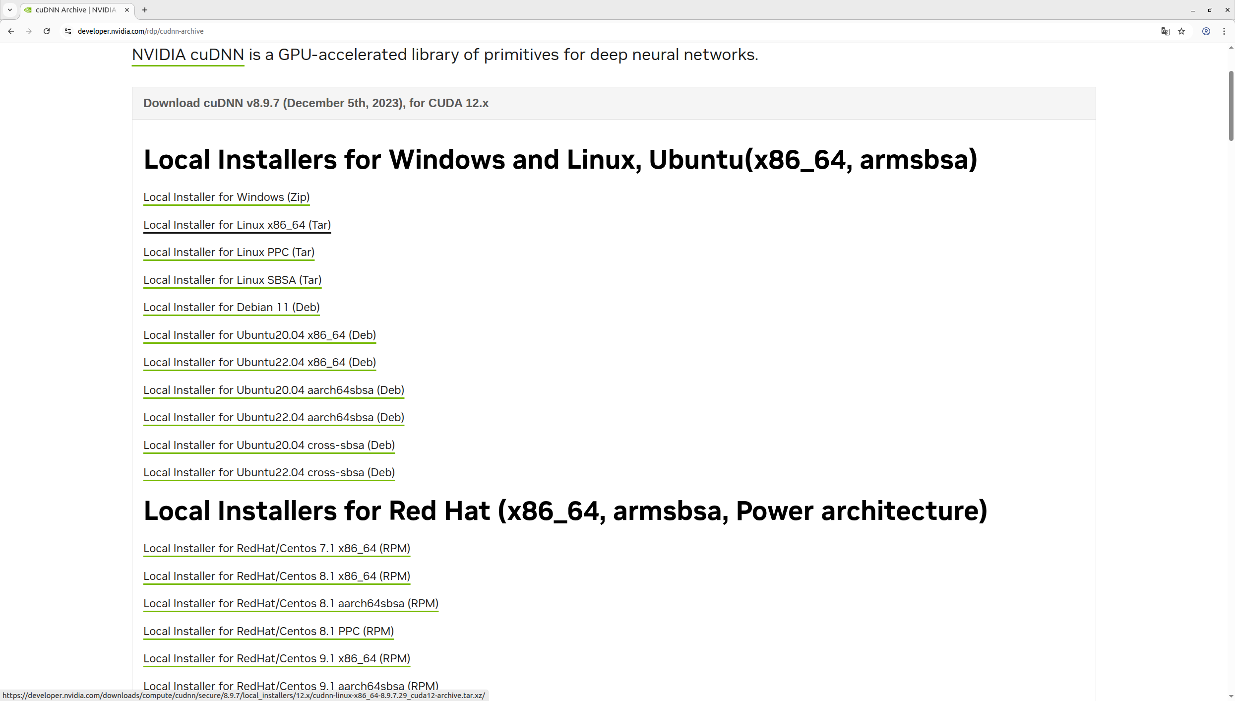 cuDNN有两种安装方式,这里我们选择下载tar方式,点击linux版本安装包进行下载。
