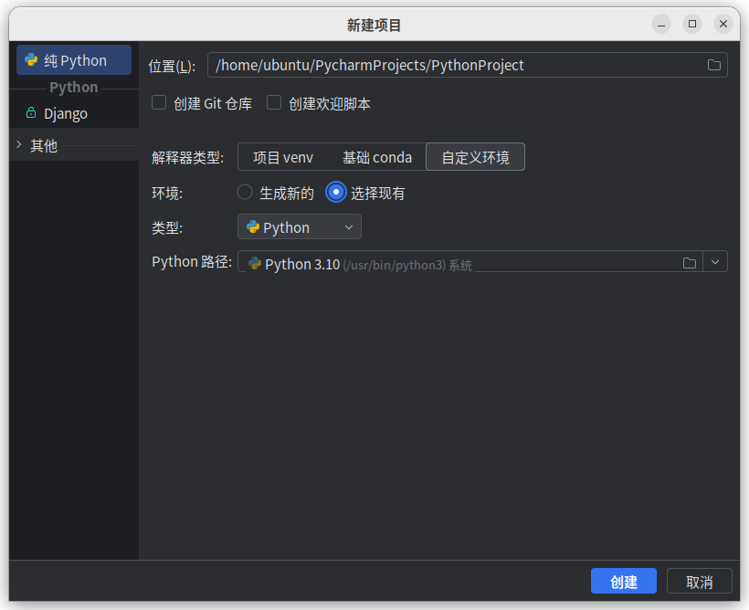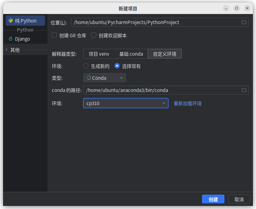 这里选择自定义环境->选择现有->类型选择conda->路径默认为conda安装路径->环境选项可选择在conda下已建立的所有环境,这里选择cp310环境,即Python版本为3.10的环境,读者可根据需求自行建立环境并选择。