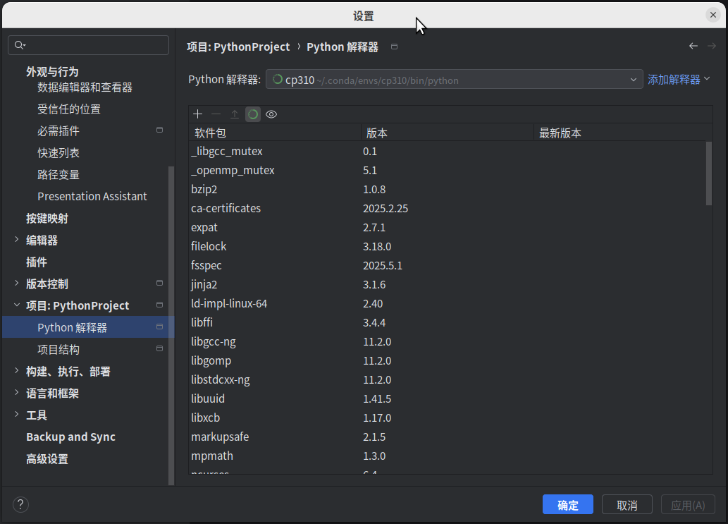 此时在设置中选择Python解释器设置,可以看到项目已加载名为cp310的解释器: