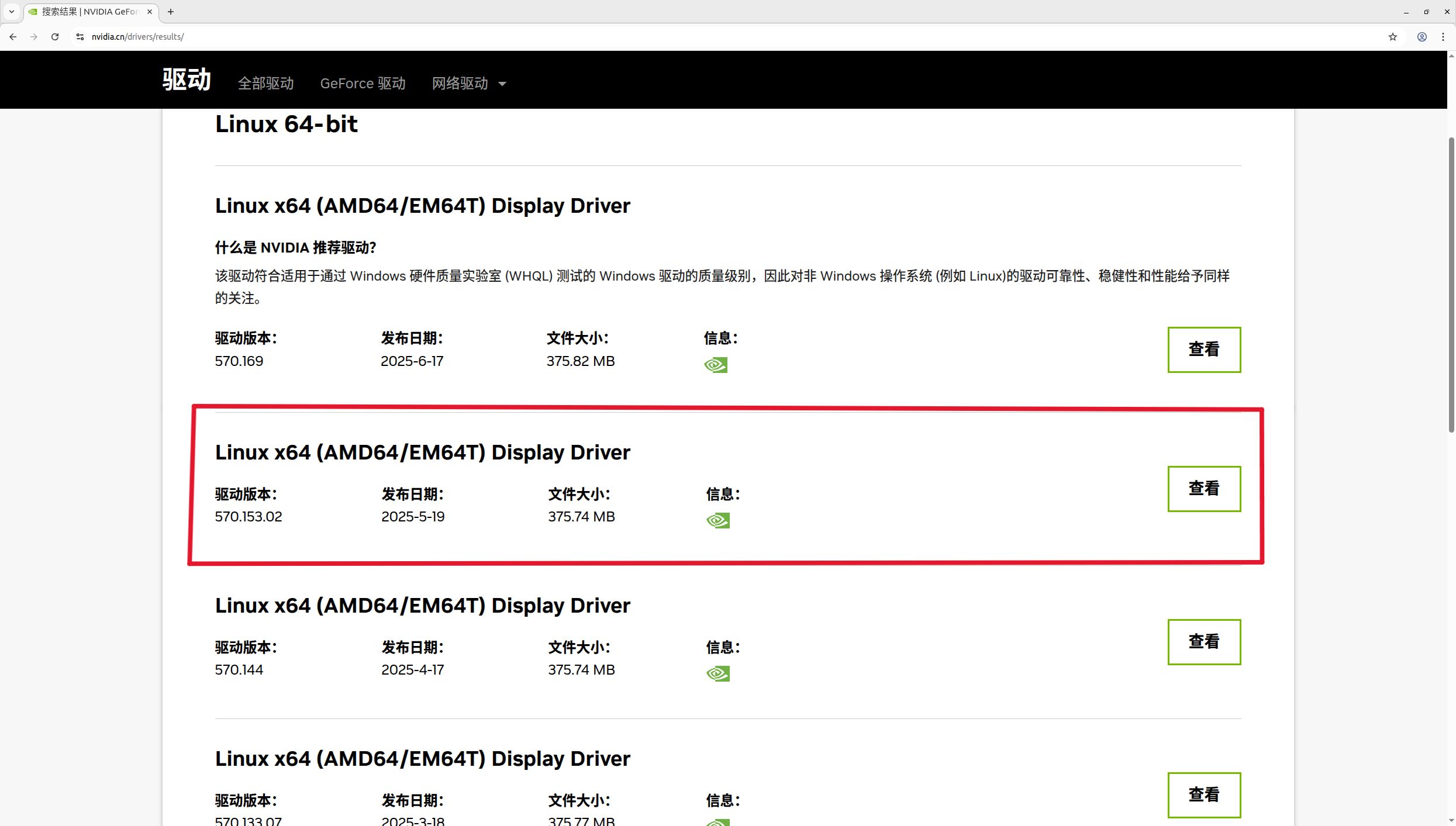 点击查找 ,会自动列出所有适用版本驱动,这里我们选择570.153.02版本驱动。