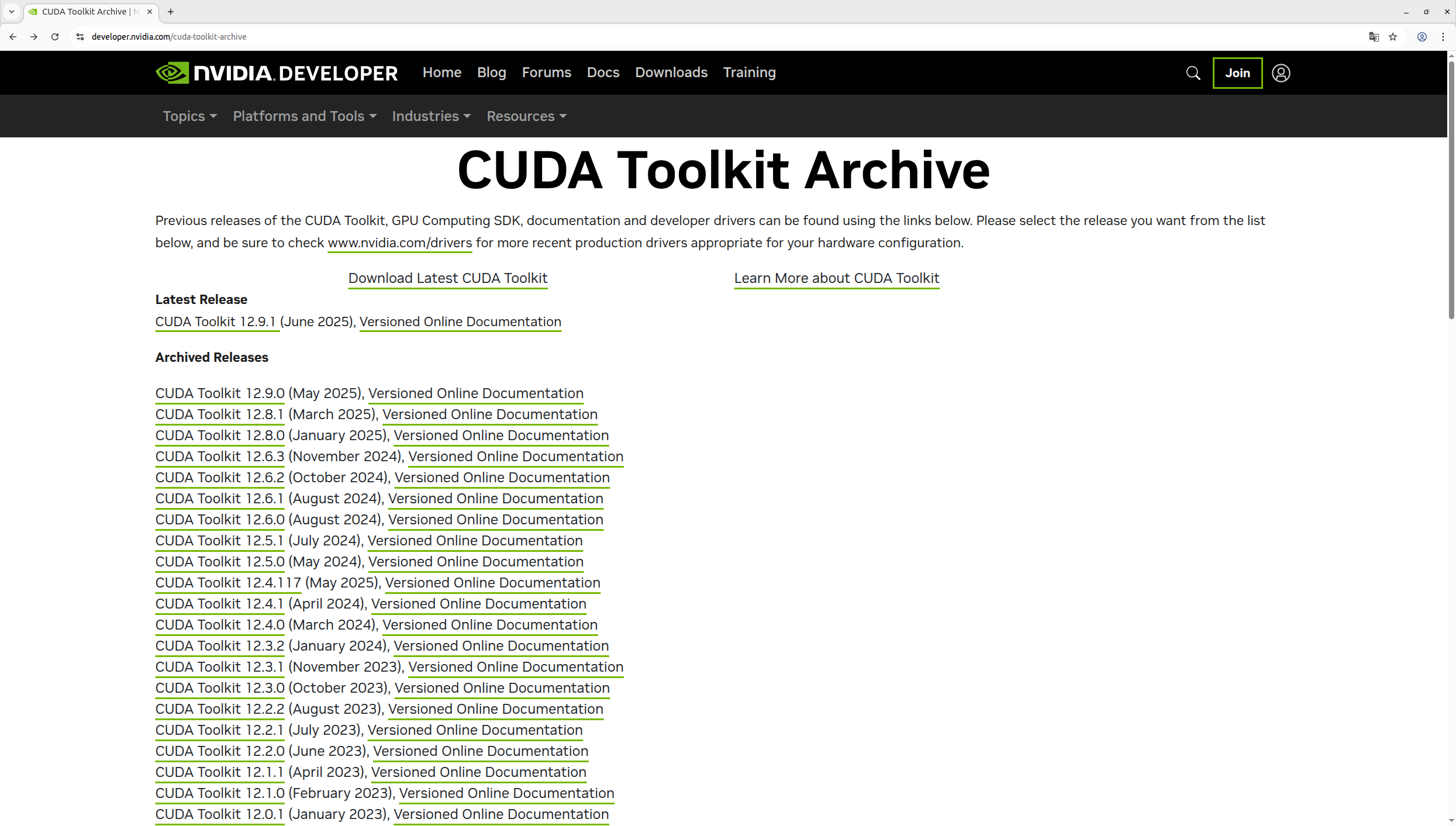 CUDA官方下载链接:CUDA Toolkit Archive | NVIDIA Developer