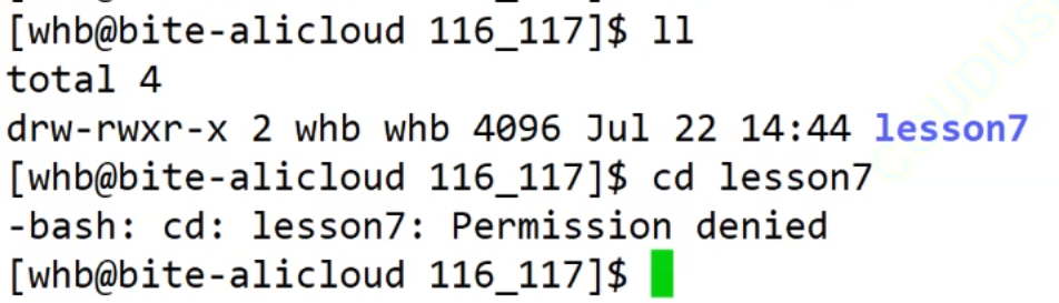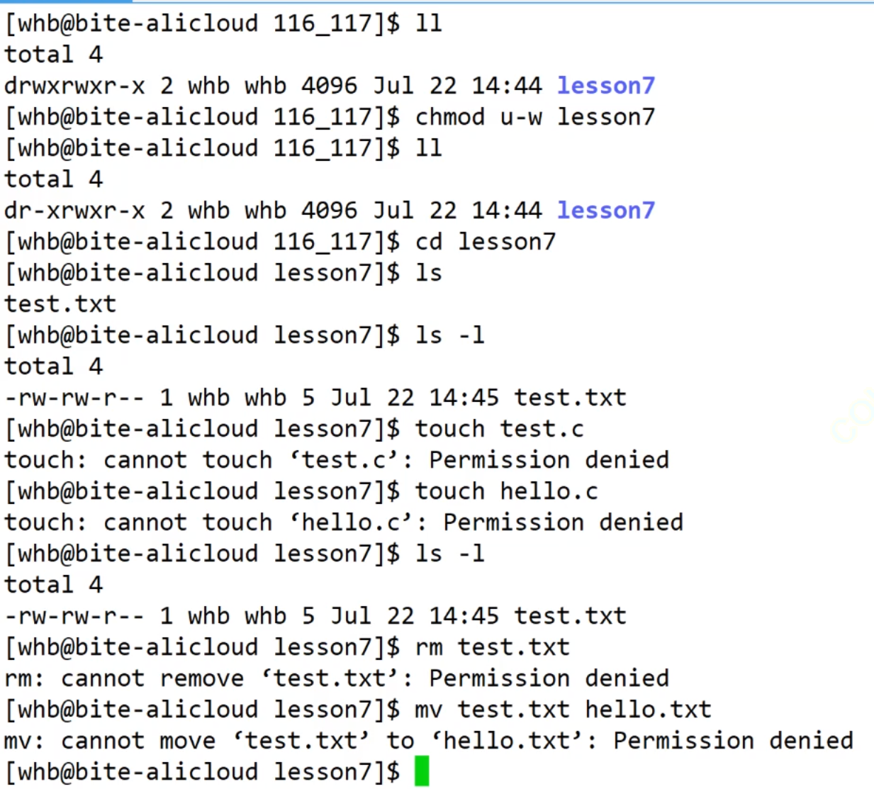 我们看到当去除目录w权限时我们还是能进入该目录,只是无法在该目录下创建文件,删除和重命名该目录下的文件。