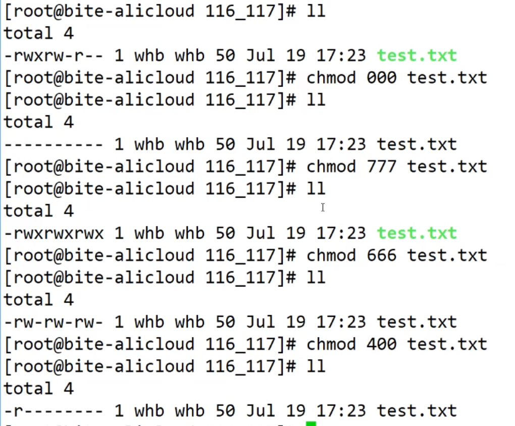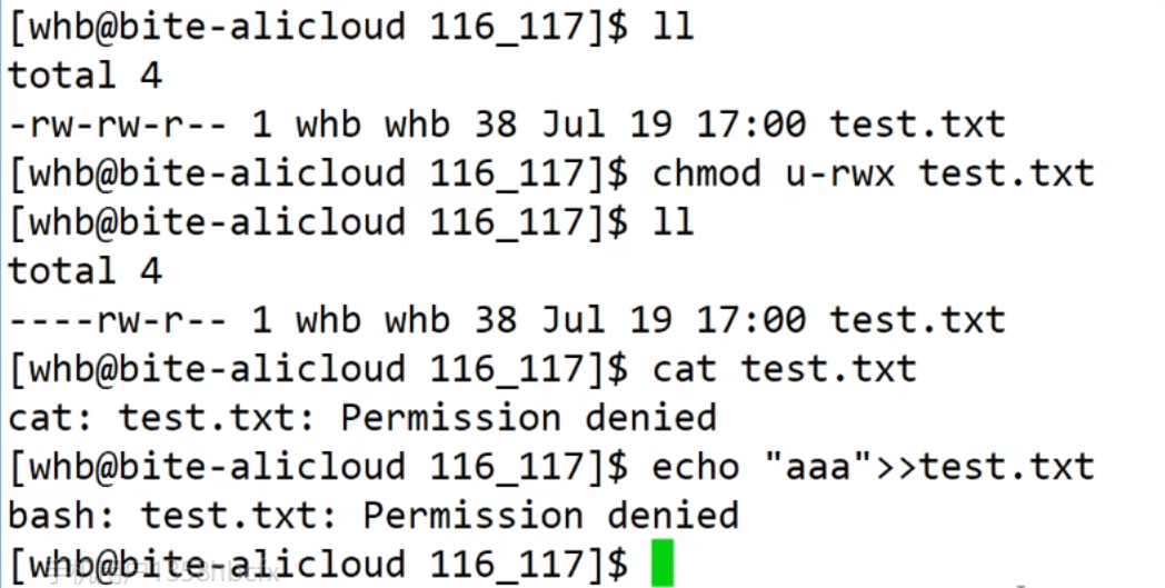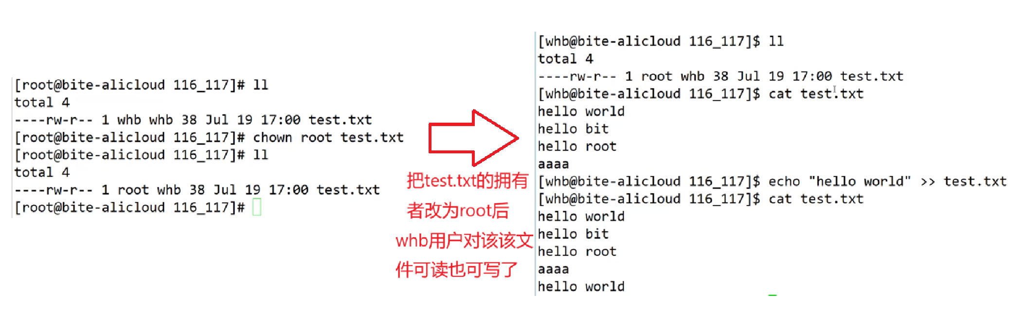 由于现在test.txt文件的拥有者被改为了root,所以whb就会被验证为所属组,所属组就有对应的读写权限。