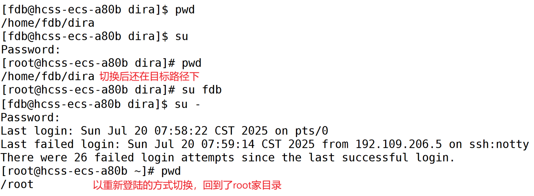 除了上面指令可以切换外,直接 su 也可以由普通用户切换为root,因为普通用户可以由多个,但是root只有一个,所以su默认就是切换到root。 还有一个指令su -,也可以完成由普通用户到root的切换,它和上面两个指令的区别是它会以目标用户重新登陆的方式切换,上面两个指令只是切换用户身份,不进行二次登陆所以不改变当前路径。