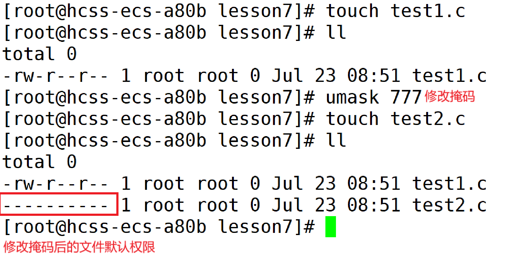 最后我们看到的权限和linux系统默认的权限不一样,这其实是linux权限掩码作用的结果。linux系统中,为了对权限进行细粒度控制,会使用权限掩码,查看当前权限掩码的指令是umask: