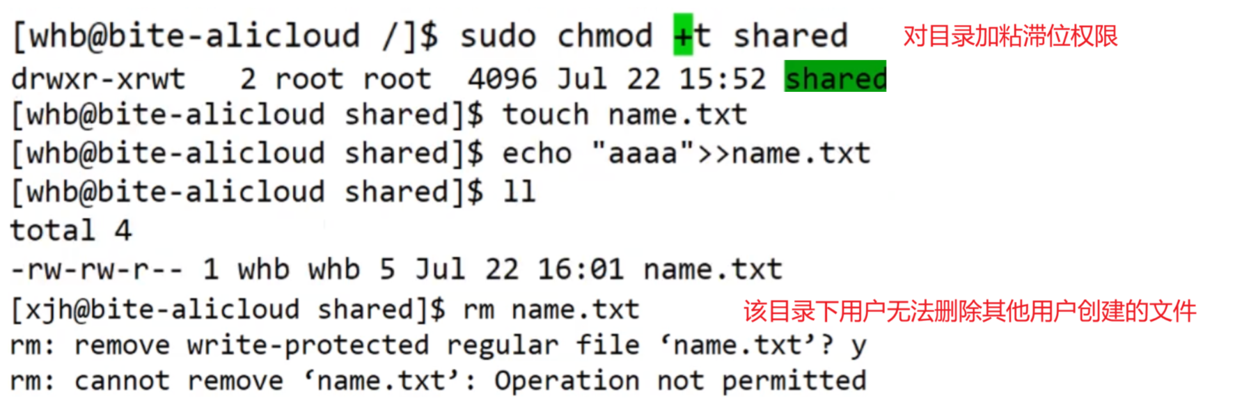 当一个目录被设置为粘滞位后通常只有root、该目录的拥有者、该文件的拥有者能删,而这种共享目录的拥有者通常是就是root。