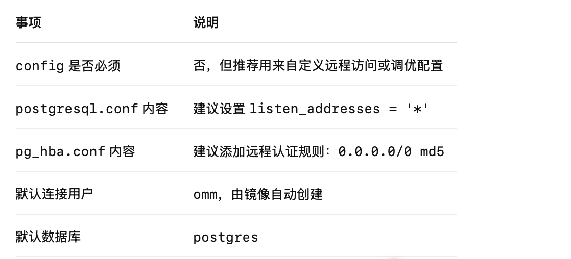 • 在 /opt/docker-volumes/opengauss/config/ 中放置如下配置(如 postgresql.conf、pg_hba.conf)