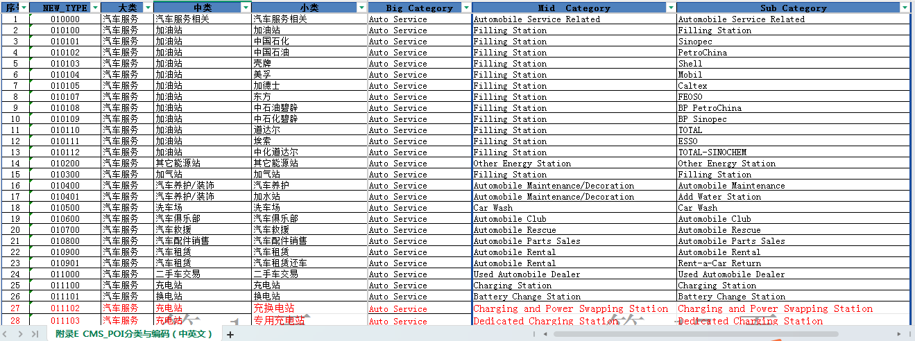 | 7 | Mid Category | POI中类英文,如:Filling Station |