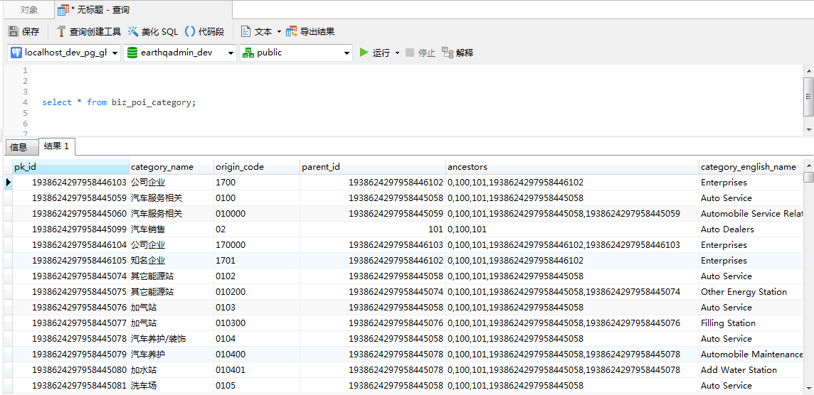 完成以上的操作后就完成了高德POI分类数据的Postgresql数据库导入操作,导入完成后就可以在数据库中查看,如下图所示: