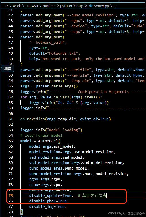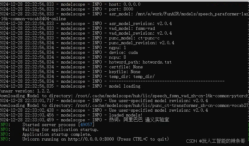 使用 funasr_wss_server.py 脚本来启动 WebSocket 服务器。下面是一个简单的启动命令示例,其中指定了端口、使用的 ASR 模型等参数: