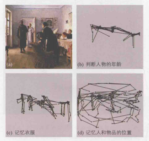 在一个经典的案例中,Yarbus(1967)记录了被试在观看画作《意外归来》(图6(a))时的眼动记录。实验任务是要求被试判断人物的年龄、记忆人物身穿衣服的颜色或记忆人物与房间中其他物品的位置关系。很明显,眼动的模式取决于被试的任务主题。当任务要求判断年龄时,被试眼动主要集中在面部(图(b));当任务要求记忆衣服时,眼动主要集中在身体上(图(c));当任务要求记忆所有人和物体的位置关系时,眼动更均匀地分布在整个画作上(图(d))。在这些过程中,眼动的位置依赖于记忆和预期。(Goldstein和Brockmole(著),张明(译),2018)