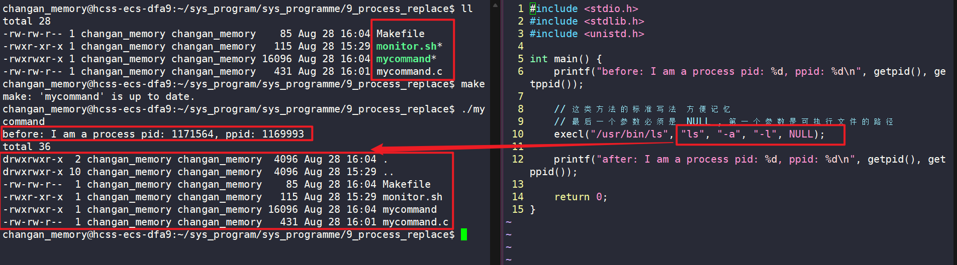 注意:这里 execl("/usr/bin/ls", "ls", "-a", "-l", NULL);是exec系列函数的标准写法,方便记忆