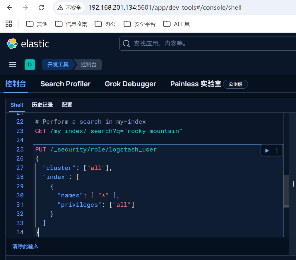 #创建角色并分配权限 PUT /_security/role/logstash_manager { "cluster": ["manage_index_templates", "manage", "all"], "index": [ { "names": [ "*" ], "privileges": ["write", "create_index", "manage"] } ] } # 创建新用户并分配角色 POST /_security/user/logstash_user { "password": "Admin123", "roles": ["logstash_manager"], "full_name": "Logstash User", "email": "logstash_user@example.com" }