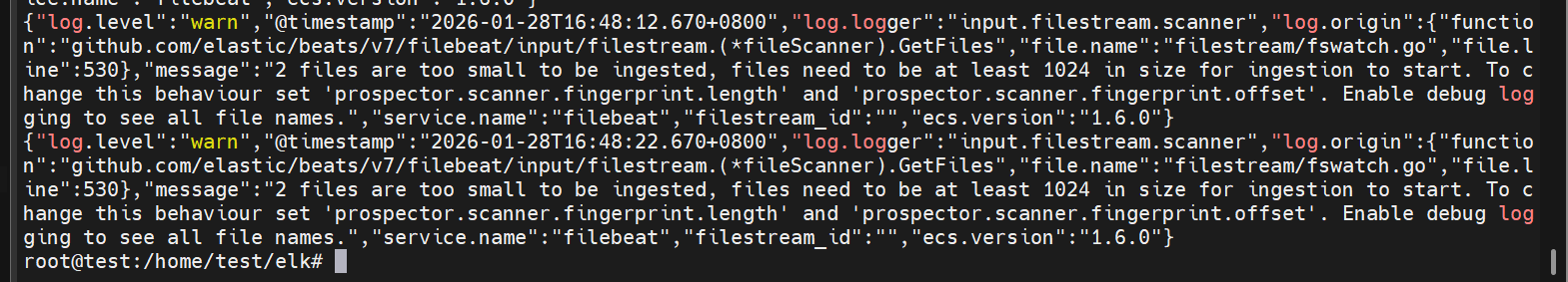 日志至少1024字节,不然filebeat读不到。
