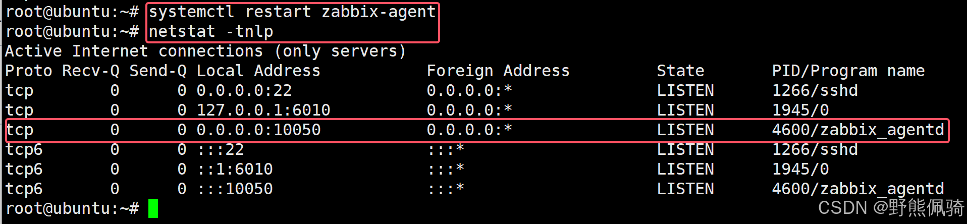 root@ubuntu:~# systemctl restart zabbix-agent root@ubuntu:~# netstat -tnlp