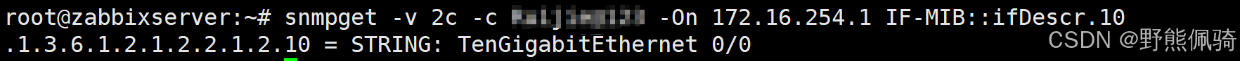 root@zabbixserver:~# snmpget -v 2c -c SNMP团体字 -On 172.16.254.1 IF-MIB::ifDescr.10 -v: 指定设备使用的SNMP版本,此处是2c版本; -c: 指定设备使用的SNMP团体字; -On:指定被监控设备主机的IP地址,此处是172.16.254.1; IF-MIB::ifDescr.10: 指需要转换为OID的MIB名称,此处是端口名称。