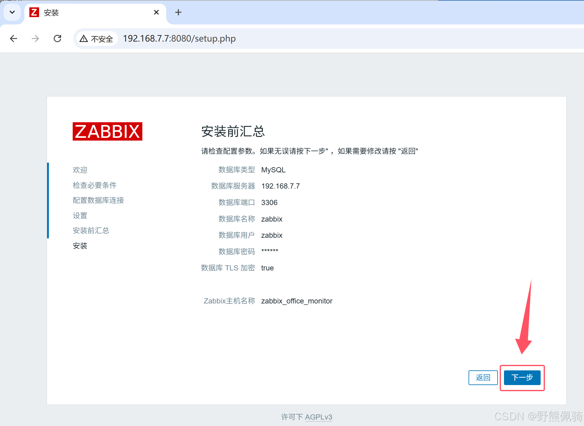 - 根据上面第3步的数据库信息,配置好zabbix数据库相关内容,点击“下一步”