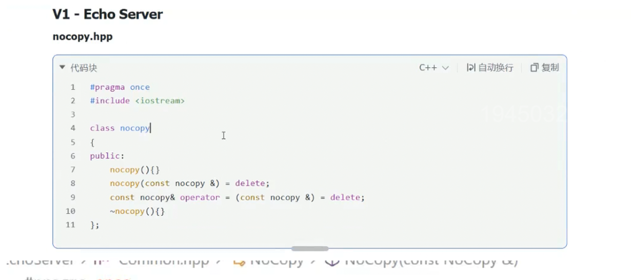 第 8 行:nocopy(const nocopy &) = delete; —— 禁用拷贝构造函数,防止通过已有对象创建新的拷贝对象;