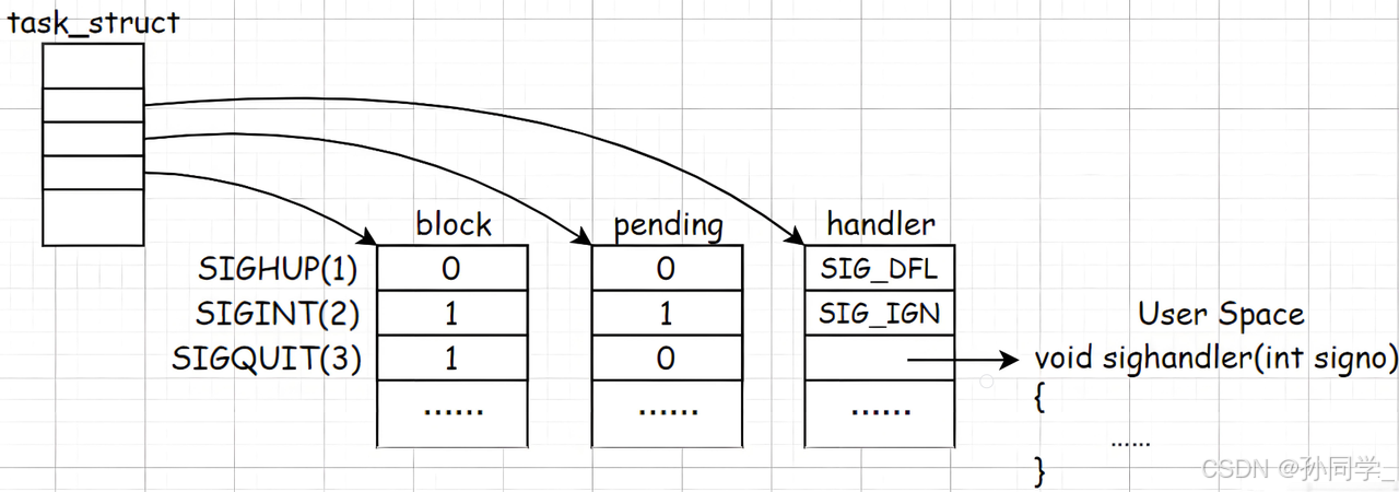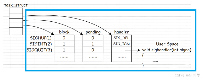 所以当前有没有信号,有没有被阻塞,怎么处理我们就知道了。这三张表合起来,共同承担了进程怎么识别信号。