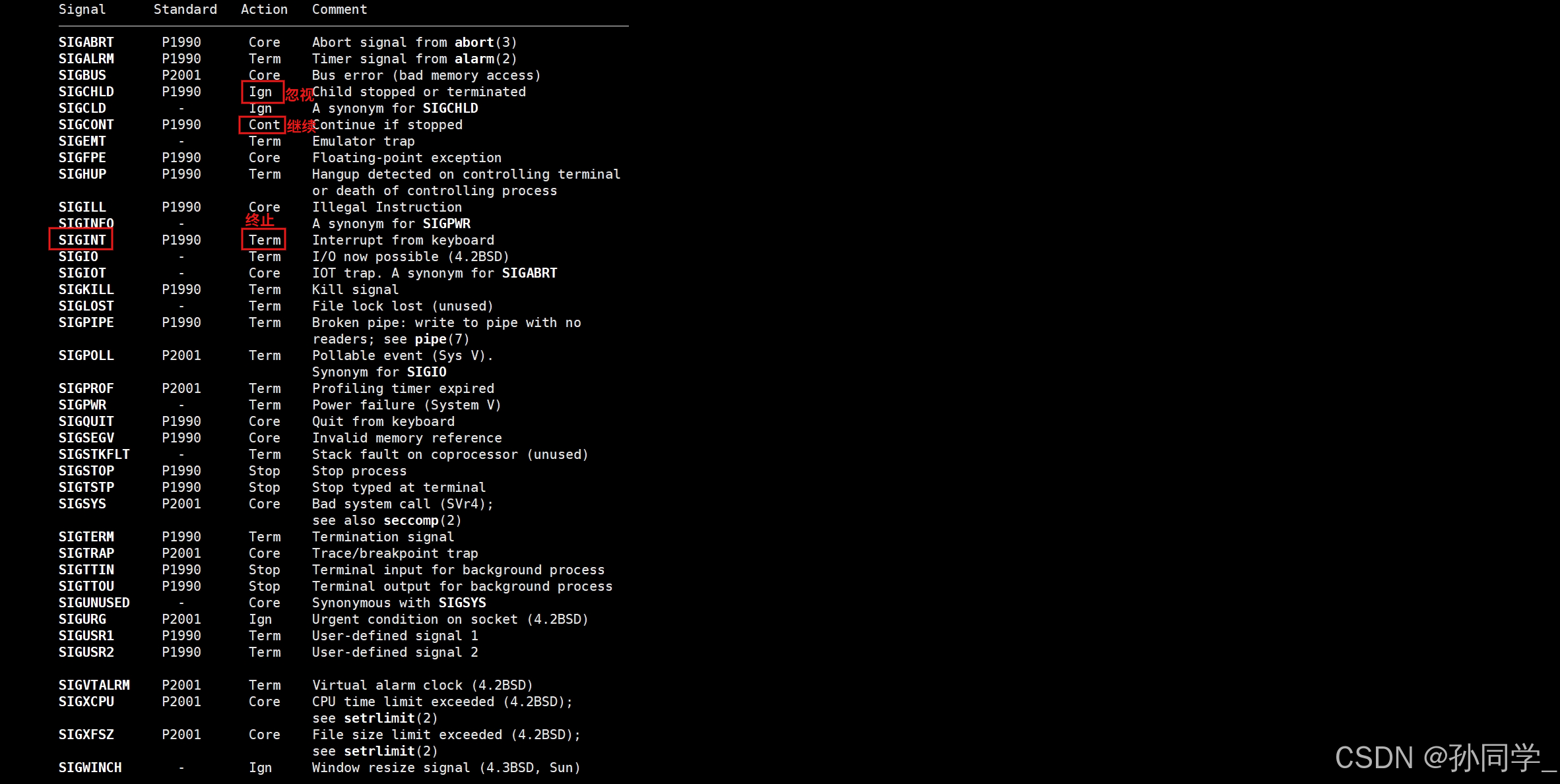 查看所有信号的额默认处理:man 7 signal