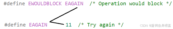 - 根据错误码errno进行区分,所以此时我们再来深入看一下EWOULDBLOCK这个宏,那么它的宏定义是一个宏EAGAIN,那么对于这个宏EAGAIN它的对应的值是11,意义是此时并没有出错,此时是资源未就绪,请再尝试一次,所以EWOULDBLOCK这个宏对应的值是恰好是11,意义和EAGAIN一致