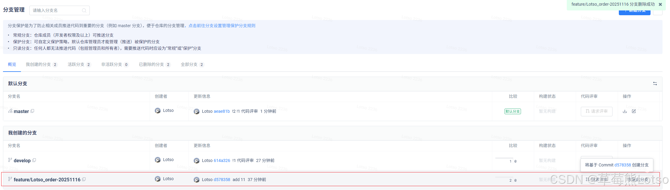 现有一个订单管理的新需求需要开发,首先可以基于 develop 分支创建一个 feature/Lotso_order-20251116分支