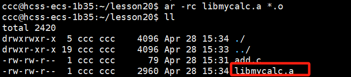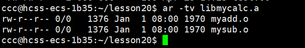 注:此时的 .h、.c、.o 文件位于 lesson20 文件夹中,而静态库文件 .a 位于mylib文件夹中