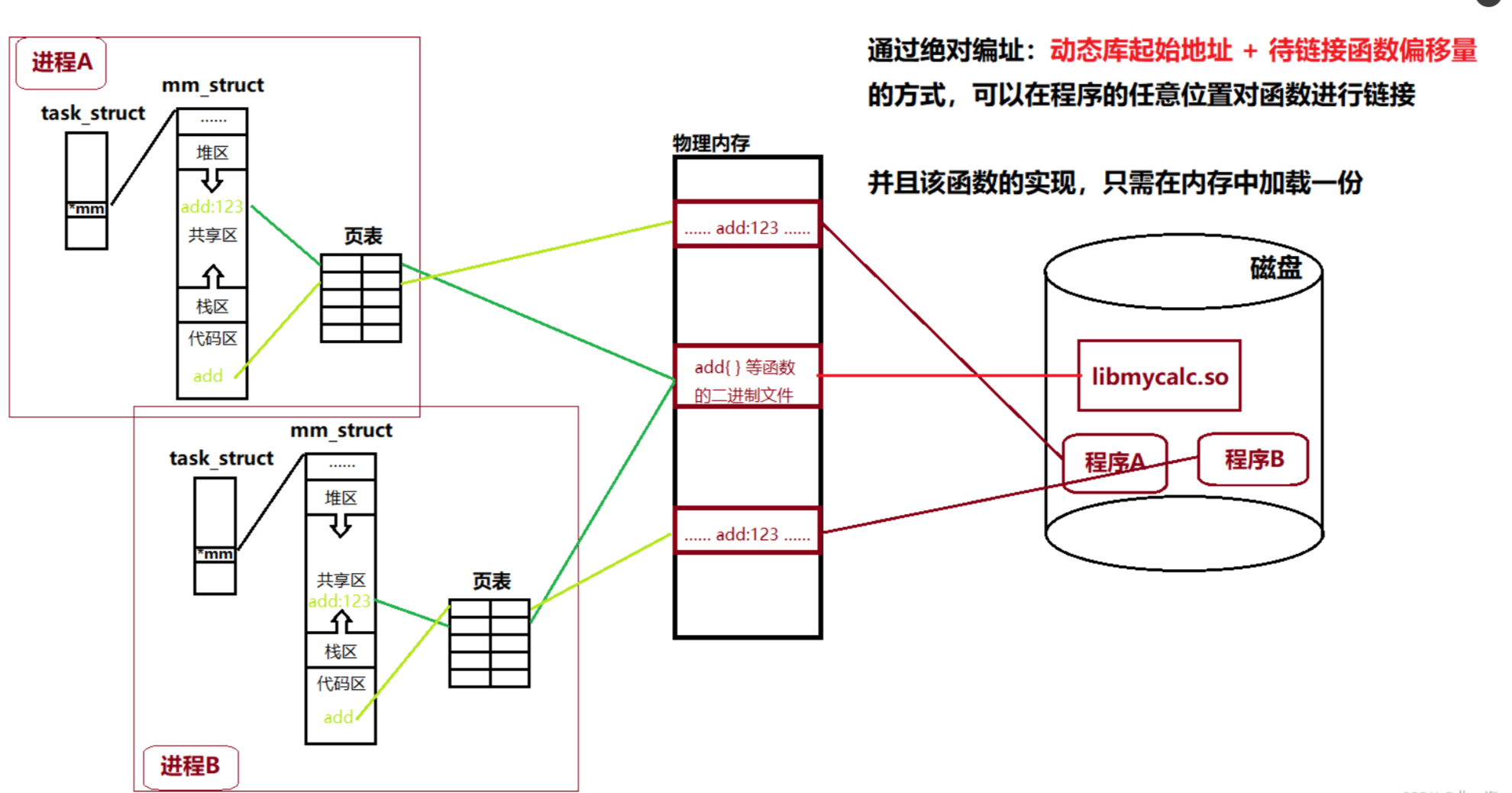 相对地址的方式进行链接,同一个函数的动态库起始地址+所链接函数偏移量值相同,代码只需要加载一份,并且可以任意位置进行函数调用(与位置无关)